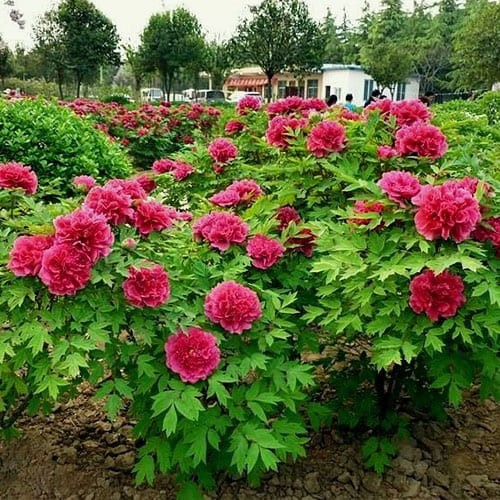 Цветки размещаются на конечностях стеблей, их диаметр составляет 12-20 см и больше. Такие цветы бывают махровые, полумахровые и обычные, но не менее красивые. Они могут быть белые, фиолетовые, желтые, розовые, малиновые, а также сочетать два цвета (как, например, сорт "Сестры Киао"). С возрастом цветение становится обильнее. Древовидный пион начинает цвести на 2 недели раньше обычного травянистого, и продолжается такое цветение до месяца! Эти пионы устойчивы к холоду и морозам.