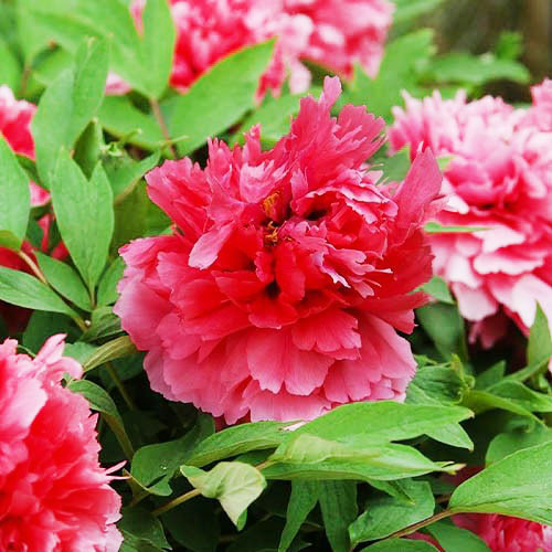 Великолепный пион Као древовидный способен достичь высоты 120-150 см. Его крупные густомахровые соцветия диаметром 20-25 см с желтой сердцевиной поражают удивительными оттенками рубина, пурпура и коралла. Обильно цветет в мае 8-15 дней, окутывая сад легким пряным ароматом.